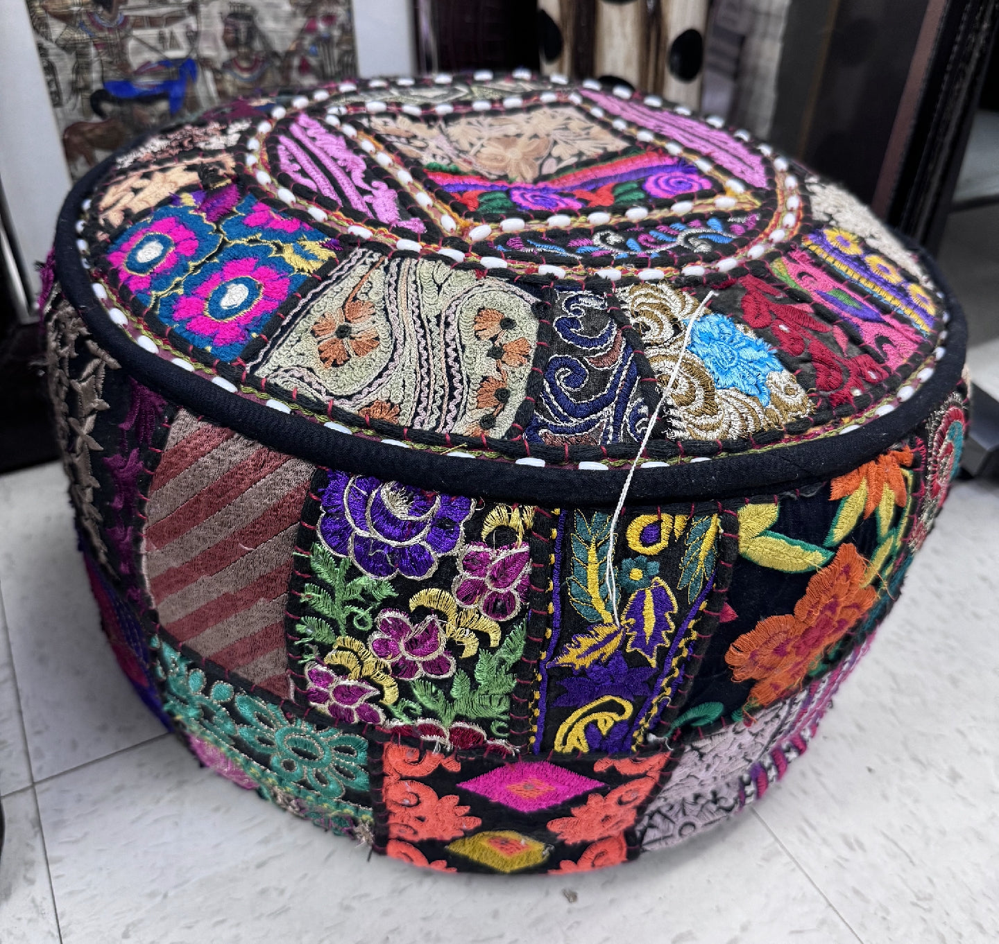 Expertly crafted in Morocco, our multicolored ottoman is a stunning addition to any living space. Each one is handmade and hand beaded for a truly unique piece. Elevate your decor with this beautiful, one-of-a-kind ottoman!