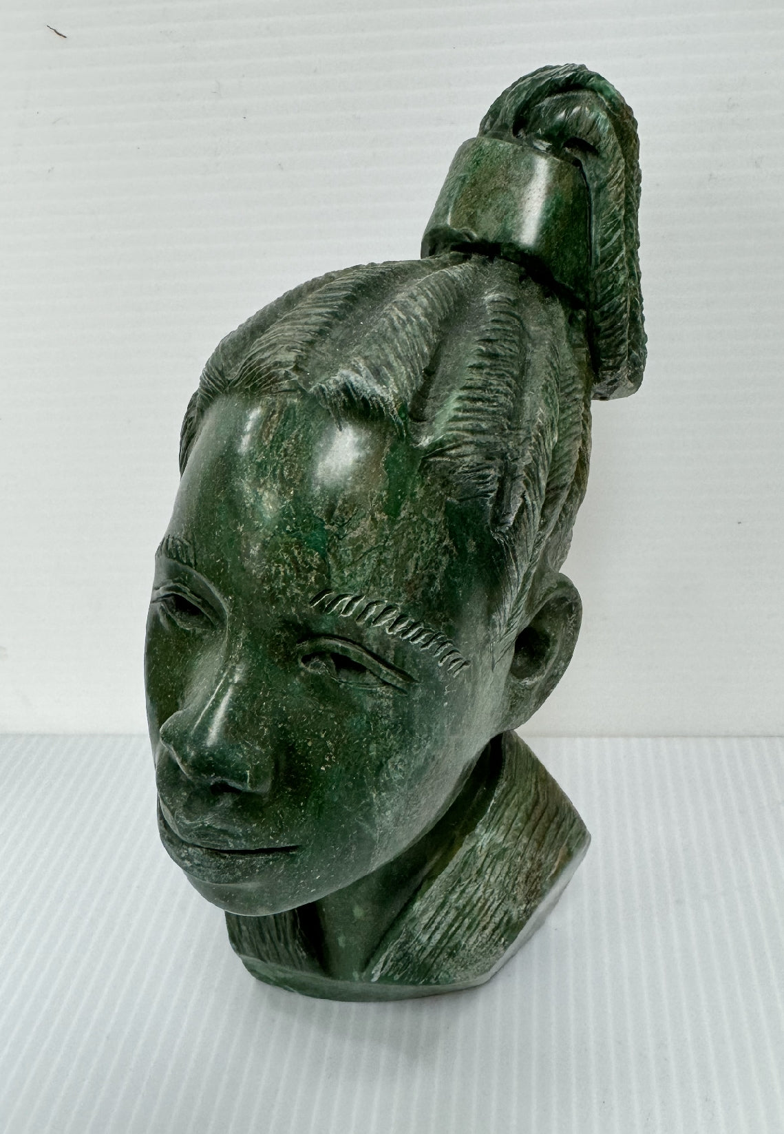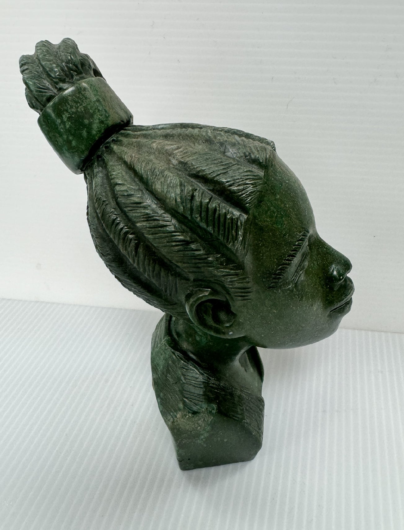 Add a touch of sophistication and elegance to your home decor with The Shona Lady. This unique and inspiring work of art was hand crafted in Zimbabwe from serpentine stone, making it a one-of-a-kind statement piece. A must-have for any art lover!